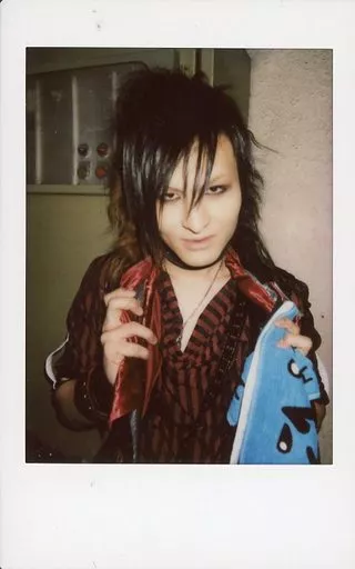 Japanese title: 生写真(男性)/ヴィジュアル系バンド/A&D A&D/IRU/バストアップ・衣装赤・黒・両手ジャケット・左手タオル・背景グレー/生チェキ