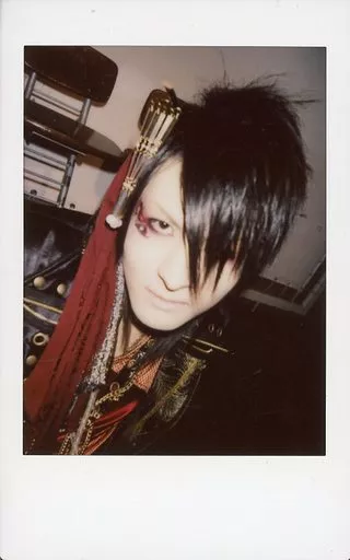 Japanese title: 生写真(男性)/ヴィジュアル系バンド/A&D A&D/IRU/バストアップ・衣装黒・赤・両手下げ・斜め・背景グレー/生チェキ