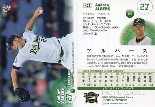 Japanese title: BBM/レギュラーカード/オリックス・バファローズ/BBM2018 ベースボールカード 2ndバージョン 431 [レギュラーカード] : アルバース