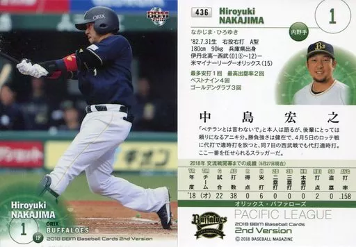 Japanese title: BBM/レギュラーカード/オリックス・バファローズ/BBM2018 ベースボールカード 2ndバージョン 436 [レギュラーカード] : 中島宏之