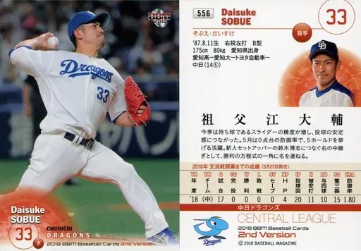 Japanese title: BBM/レギュラーカード/中日ドラゴンズ/BBM2018 ベースボールカード 2ndバージョン 556 [レギュラーカード] : 祖父江大輔