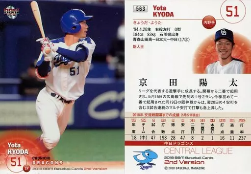 BBM / Regular Card / Chunichi Dragons / BBM2018 Baseball Card 2 nd Version 563 [Regular Card] : Yota Kyoda