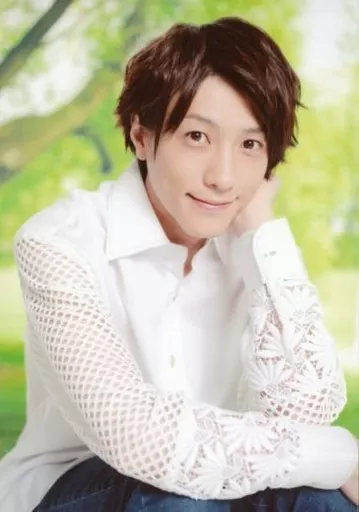 Japanese title: 生写真(男性)/俳優 鈴木拡樹/上半身・衣装白・ワイシャツ・座り・右手膝・左手顔・背景木/鈴木拡樹ファン感謝イベントin 大阪