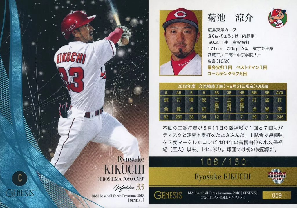 Japanese title: BBM/レギュラーカード/広島東洋カープ/BBM2018 ジェネシス 059[レギュラーカード]:菊池涼介(青箔押しパラレル版)(/150)