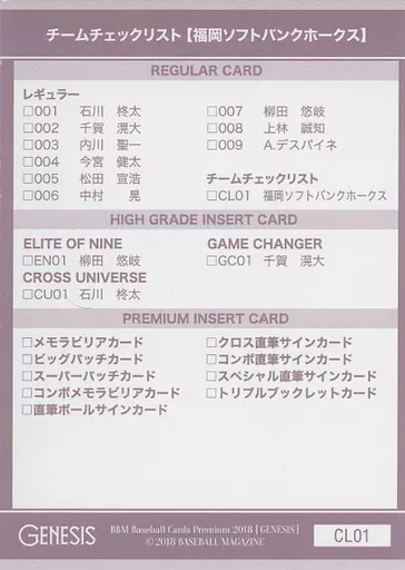Japanese title: BBM/レギュラーカード/チームチェックリスト/BBM2018 ジェネシス CL01 [レギュラーカード] : 福岡ソフトバンクホークス