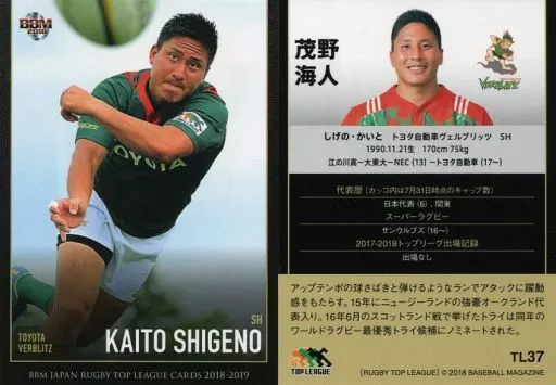 BBM / Regular Card / Toyota Ver. Blitz / BBM2018 Japan Rugby Top League 2018-2019 TL37 [Regular Card] : Kaito Shigeno