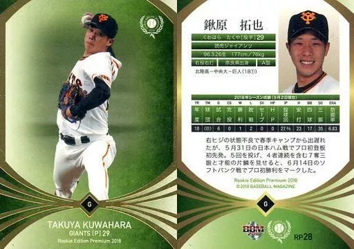 Japanese title: BBM/レギュラーカード/読売ジャイアンツ/BBM2018 ルーキーエディション プレミアム RP28 [レギュラーカード] : 鍬原拓也