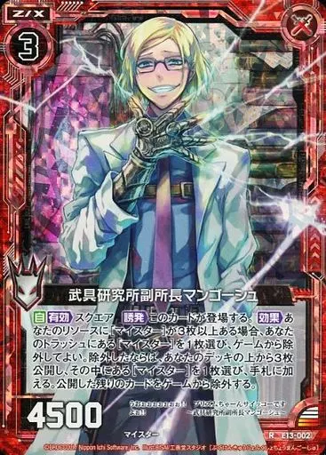 Japanese title: ゼクス/R/赤/ゼクス/EXパック 『アイドルゼクス・オン・ステージ「ゼクステージ!」』 E13-002[R]:武具研究所副所長マンゴーシュ(ホログラムレア)