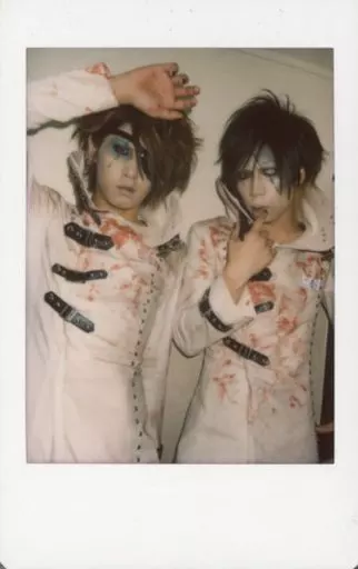 Japanese title: 生写真(男性)/ヴィジュアル系ロックバンド/アンド アンド/KAJI・キリ/上半身・衣装白黒赤・右手上げ・右手人差し指口元/生チェキ