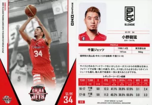 Japanese title: BBM/レギュラーカード/千葉ジェッツ/BBM2019 B.LEAGUE TRADING CARDS 2018-19 SEASON FAST BREAK 1st Half 016 [レギュラーカード] : 小野龍猛