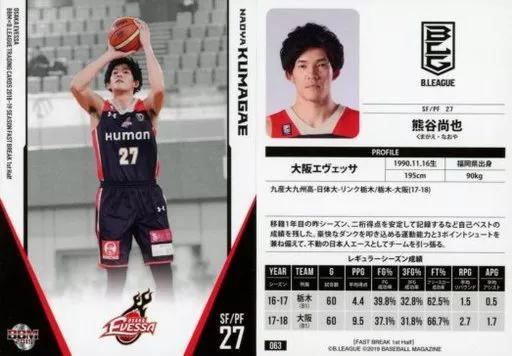 BBM / Regular Card / Osaka Evessa / BBM2019 b. LEAGUE TRADING CARDS 2018-19 SEASON FAST BREAK 1 st Half 063 [Regular Card] : Naoya Kumagai