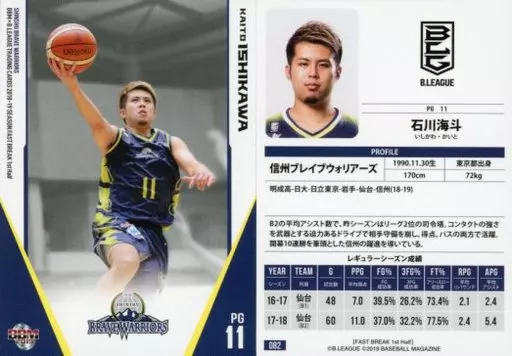 BBM / Regular Card / Shinshu Brave Warriors / BBM2019 b. LEAGUE TRADING CARDS 2018-19 SEASON FAST BREAK 1 st Half 082 [Regular Card] : Kaito Ishikawa