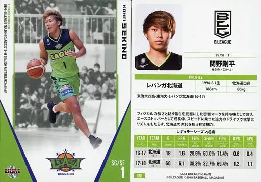 BBM / Regular Card / Levanga Hokkaido / BBM2019 b. LEAGUE TRADING CARDS 2018-19 SEASON FAST BREAK 2 nd Half 091 [Regular Card] : Gōhei Sekino