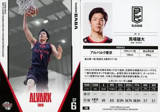 Japanese title: BBM/レギュラーカード/アルバルク東京/BBM2019 B.LEAGUE TRADING CARDS 2018-19 SEASON FAST BREAK 2nd Half 108 [レギュラーカード] : 馬場雄大