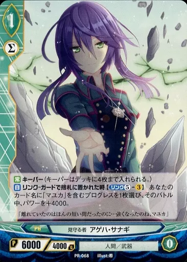 Japanese title: アンジュ・ヴィエルジュ/PR/緑/PG/人間/武器/2015年01月ショップ大会参加賞 PR-068[PR]:見守る者 アゲハ・サナギ