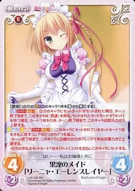 Japanese title: カオス/RR/Chara/地/ブースターパック 世界と世界の真ん中で & 運命線上のφ LoS-102[RR]:果凜のメイド「リーニャ・エーレンスレイヤー」
