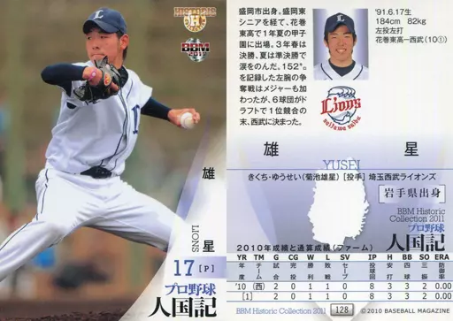Japanese title: BBM/レギュラーカード/現役/埼玉西武ライオンズ/BBM2011 ヒストリックコレクション 人国記 都道府県別ヒーロー列伝 128 [レギュラーカード] : 雄星