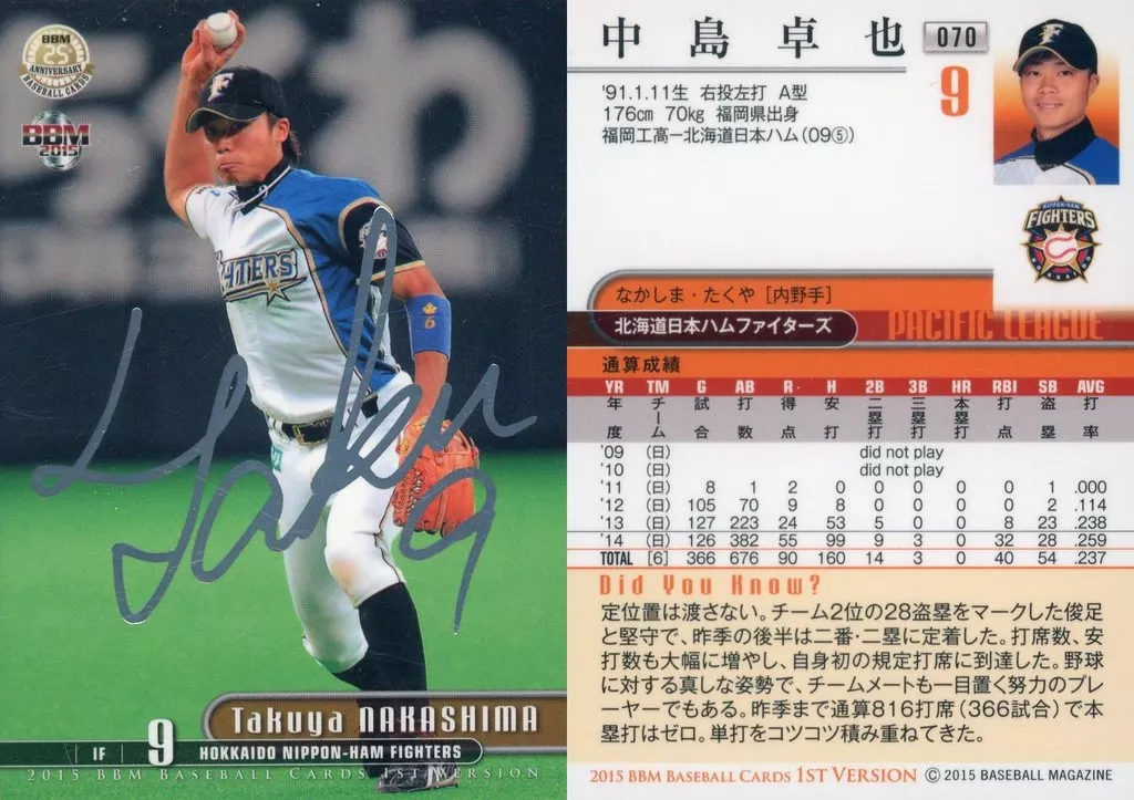 Japanese title: BBM/レギュラーカード/北海道日本ハムファイターズ/BBM2015 ベースボールカード 1stバージョン 070[レギュラーカード]:中島卓也(銀箔押しサイン入り)