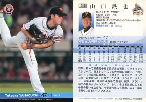 Japanese title: BBM/レギュラーカード/読売ジャイアンツ/BBM 2010 ベースボールカード 1stバージョン 010 [レギュラーカード] : 山口鉄也