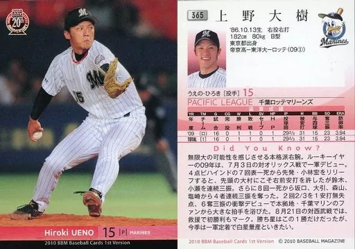 Japanese title: BBM/レギュラーカード/千葉ロッテマリーンズ/BBM 2010 ベースボールカード 1stバージョン 365 [レギュラーカード] : 上野大樹