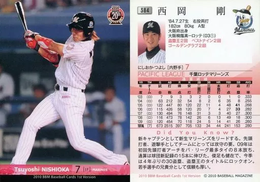 Japanese title: BBM/レギュラーカード/千葉ロッテマリーンズ/BBM 2010 ベースボールカード 1stバージョン 384 [レギュラーカード] : 西岡剛