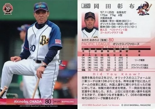 Japanese title: BBM/レギュラーカード/オリックス・バファローズ/BBM 2010 ベースボールカード 1stバージョン 397 [レギュラーカード] : 岡田彰布