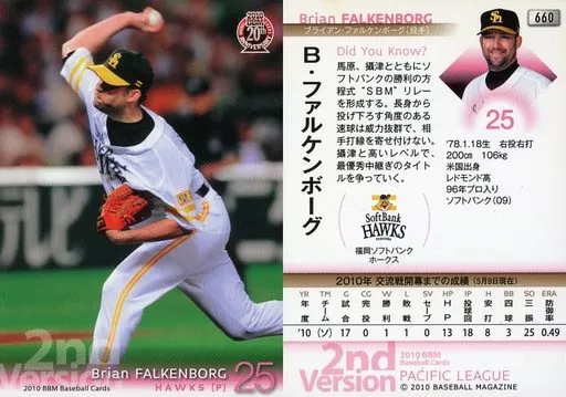 Japanese title: BBM/レギュラーカード/福岡ソフトバンクホークス/BBM 2010 ベースボールカード 2ndバージョン 660 [レギュラーカード] : ファルケンボーグ