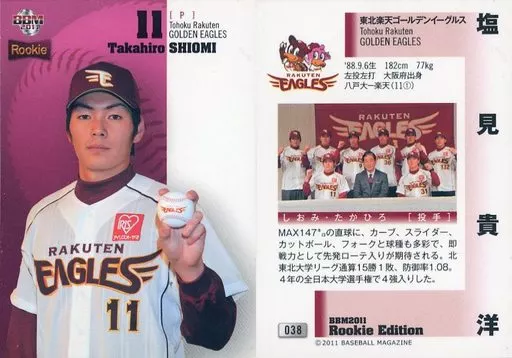 Japanese title: BBM/レギュラーカード/ルーキーレギュラー/東北楽天ゴールデンイーグルス/BBM2011 ルーキーエディション 038 [レギュラーカード] : 塩見貴洋