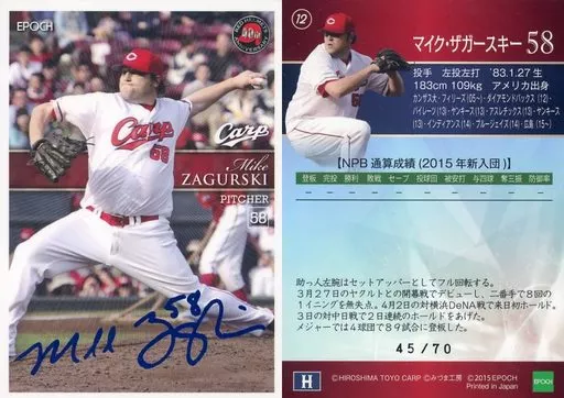 Japanese title: スポーツ/レギュラーカード/2015広島東洋カープ 赤ヘル誕生40周年カード 12[レギュラーカード]:ザガースキー(青箔押しサイン入り)(/70)