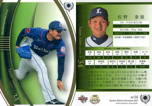 Japanese title: BBM/レギュラーカード/埼玉西武ライオンズ/BBM2015 ベースボールカード ルーキーエディション プレミアム RP14 [レギュラーカード] : 佐野泰雄