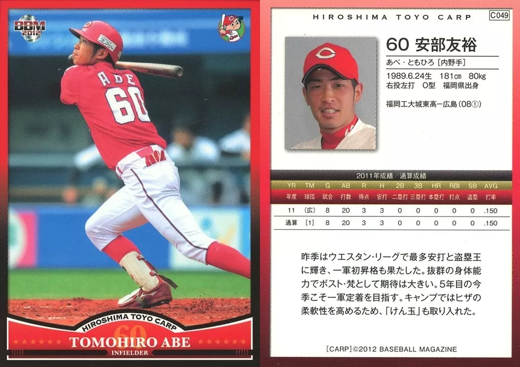 Japanese title: BBM/レギュラーカード/BBM2012 広島東洋カープ C049 [レギュラーカード] : 安部友裕