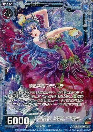 Japanese title: ゼクス/UC/ゼクス/青/第15弾『起動!超神器』 B15-028[UC]:情熱舞踏ブラジェラ(ホログラムレア)