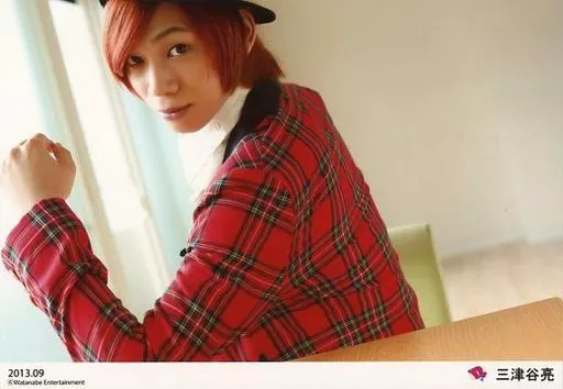 Japanese title: 生写真(男性)/俳優 D2/三津谷亮/横型・上半身・衣装赤チェック柄・帽子・背中見せ・振り向き・左手上げ・「2013.09」/公式生写真