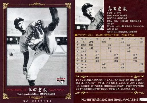 Japanese title: BBM/レギュラーカード/大陽ロビンス/BBM2012 NO-HITTERS「PB歴代ノーヒットノーラン達成者カード」 21 [レギュラーカード] : 真田重蔵