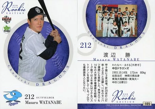Japanese title: BBM/レギュラーカード/中日ドラゴンズ/BBM2016 ルーキーエディション 105 [レギュラーカード] : 渡辺勝