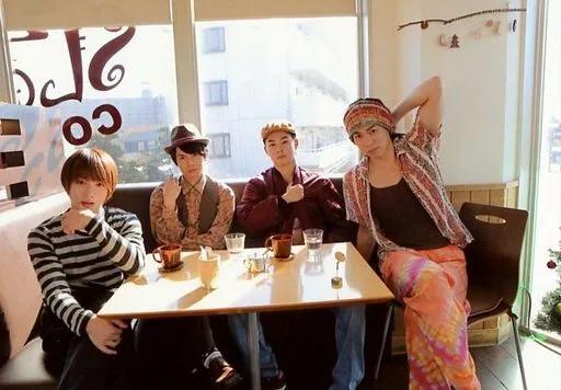 Official photo (male) / actor Gathering (4 persons) / Landscape, Kneecaps, Seats, Costumes : Black, White, Red, Beige, Hat, Isogai, Left Head / A Set / Eiga 「 Fair Trade Boy 2 」