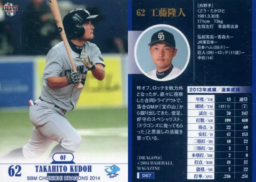Japanese title: BBM/レギュラーカード/BBM2014 中日ドラゴンズ D67 [レギュラーカード] : 工藤隆人
