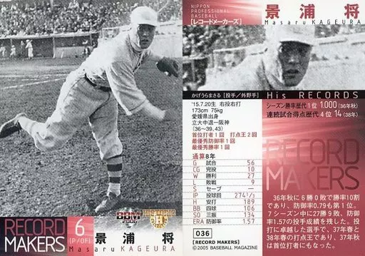 Japanese title: BBM/レギュラーカード/OB選手/阪神タイガース/BBM2006 ヒストリックコレクション レコードメーカーズ 036 [レギュラーカード] : 景浦将