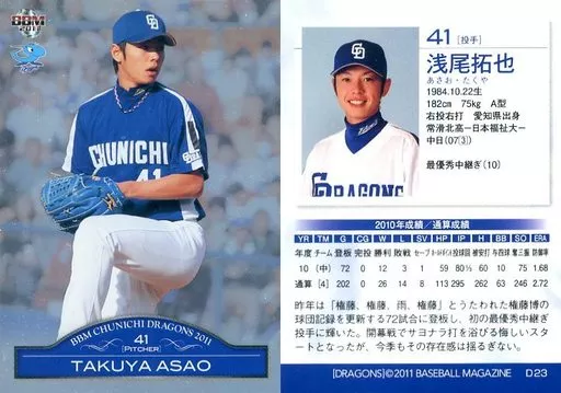 Japanese title: BBM/レギュラーカード/BBM2011 中日ドラゴンズ D23 [レギュラーカード] : 浅尾拓也(パラレル版)