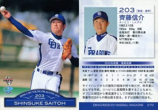 BBM / Regular Card / BBM2011 Chunichi Dragons D70 [Regular Card] : Shinsuke Saitō
