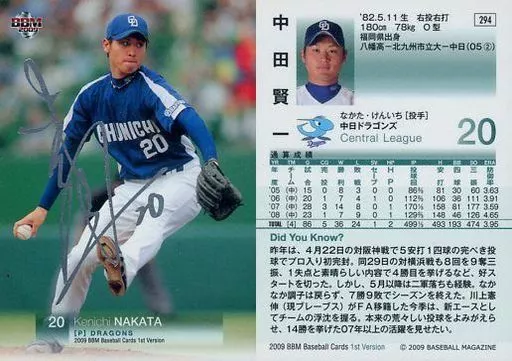 Japanese title: BBM/レギュラーカード/中日ドラゴンズ/BBM2009 ベースボールカード 1stバージョン 294 [レギュラーカード] : 中田賢一(銀箔押しサイン入り)