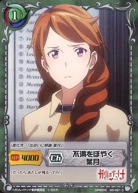 Japanese title: ジーククローネ/C/キャラクター/緑/ブースターパック「ガリレイドンナ」 GD-021[C]:不満をぼやく 葉月