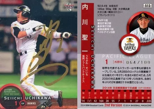 Japanese title: BBM/レギュラーカード/福岡ソフトバンクホークス/BBM2014 ベースボールカード 2ndバージョン 513[レギュラーカード]:内川聖一(金箔サイン入り)(/100)