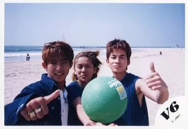 Japanese title: 生写真(ジャニーズ)/アイドル/V6 V6/三宅・森田・岡田/横型・バストアップ・衣装青・緑のビーチボール・背景砂浜、海/公式生写真