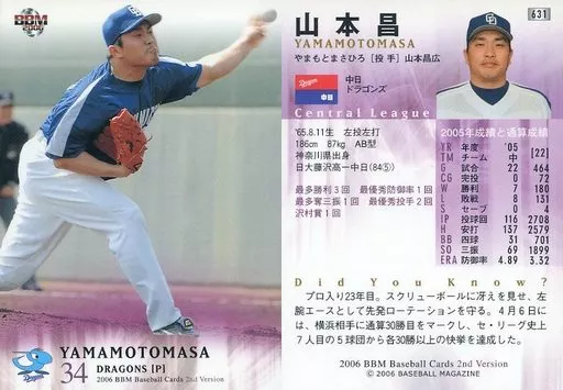 Japanese title: BBM/レギュラーカード/BBM2006ベースボールカード2nd 631:山本昌「中日ドラゴンズ」