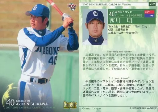 Japanese title: BBM/レギュラーカード/BBM2007ベースボールカード1st 252 : 西川明「中日ドラゴンズ」