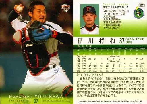 Japanese title: BBM/レギュラーカード/東京ヤクルトスワローズ/BBM2008 ベースボールカード 1stバージョン 197 [レギュラーカード] : 福川将和
