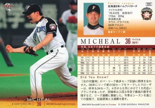 Japanese title: BBM/レギュラーカード/北海道日本ハムファイターズ/BBM2008 ベースボールカード 1stバージョン 225 [レギュラーカード] : MICHEAL