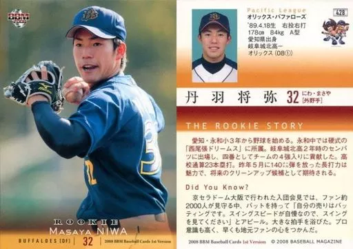 Japanese title: BBM/レギュラーカード/オリックス・バファローズ/BBM2008 ベースボールカード 1stバージョン 428 [レギュラーカード] : 丹羽将弥