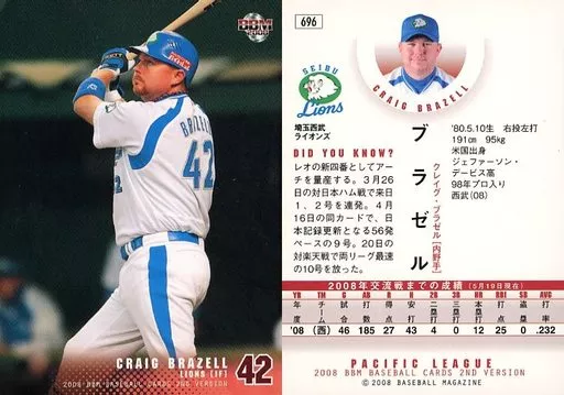Japanese title: BBM/レギュラーカード/埼玉西武ライオンズ/BBM2008 ベースボールカード2ndバージョン 696 [レギュラーカード] : ブラゼル
